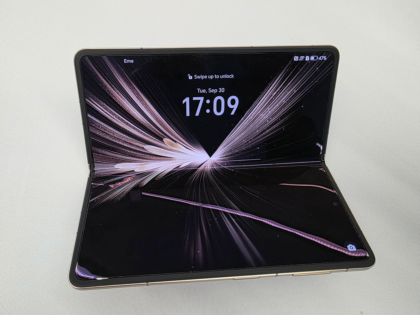 Тук е мястото да уточним, че размерите 4,1 мм. широчина в разгънато състояние и 8,8 мм. в сгънато са характерни за бялата версия – в цвят “слонова кост”, която не е достъпна у нас. Ние имахме възможност да тестваме версията в цвят “златиста зора” (Down Gold), при която тези показатели са съответно 4,2 мм. и 9 милиметра. Като цяло можем да кажем, че при работа с апарата в сгънато състояние той се усеща като стандартен несгъваем смартфон. И дебелината му е почти сравнима с това. Друга особеност на панела е, че е защитен от въглеродни влакна.