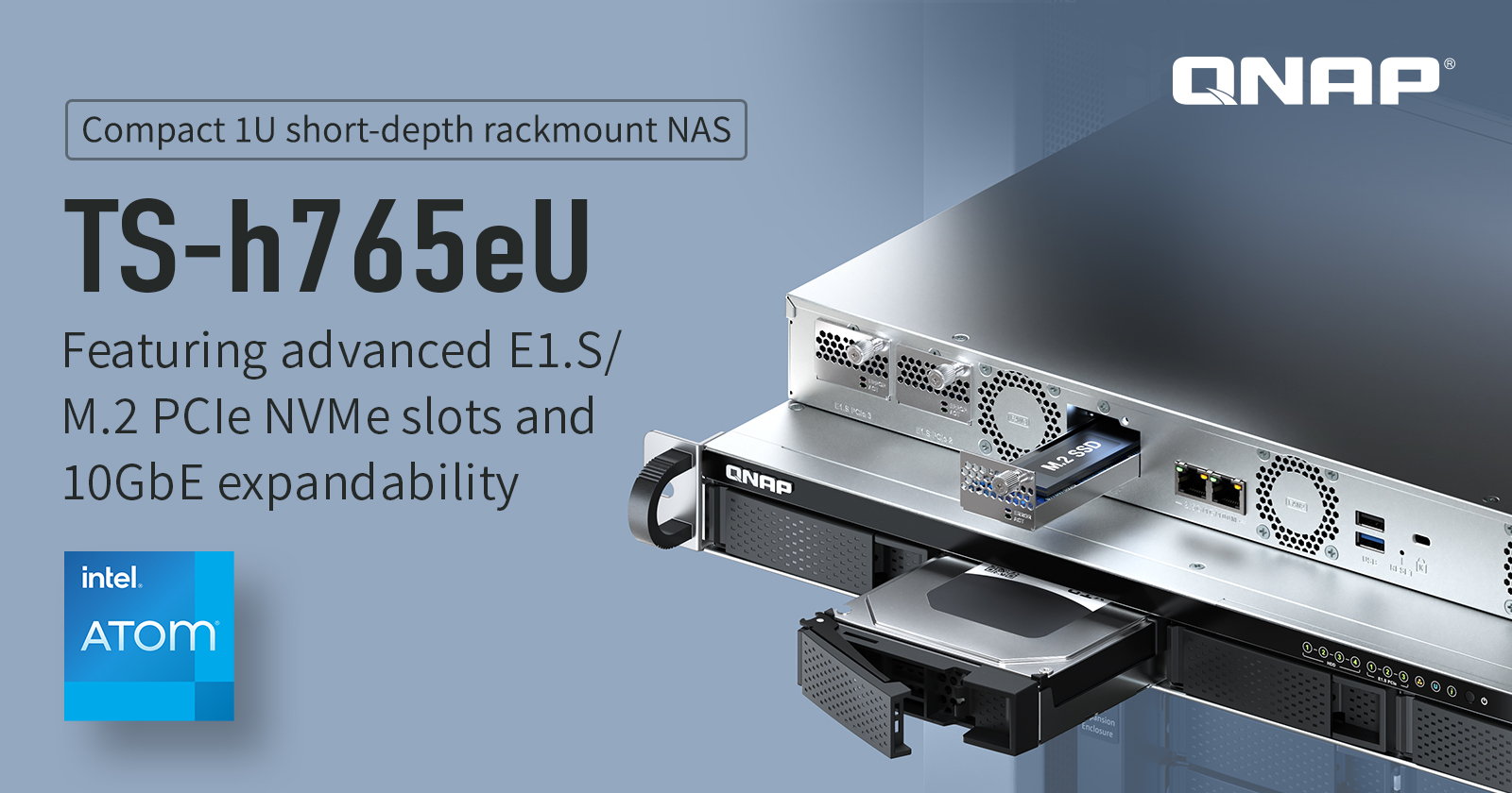 QNAP® Systems, Inc. разширява предложенията си от NAS продукти за монтаж в шкаф/стелаж. Новият 1U NAS модел TS-h765eU  се отличава с малка дълбочина, т.е. с по-късо шаси. Той разполага с 4 гнезда за дискове, 2.5 Gigabit Ethernet и е идеален за малки шкафове и стелажи в офис среди с ограничено пространство. TS-h765eU е модел с дългосрочна доставка до 2031 г., което го прави надежден избор за NAS за организации, планиращи дългосрочни проекти или внедряване на множество обекти.