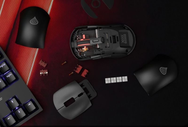Мишката притежава модулна конструкция – сменяеми горни панели и противоплъзгащи елементи, които позволяват персонализиране на формата според предпочитанията на играча. RGB подсветката добавя фин акцент, без да доминира, а PTFE плъзгачите и заоблените им ръбове осигуряват плавно движение върху всякакви повърхности.